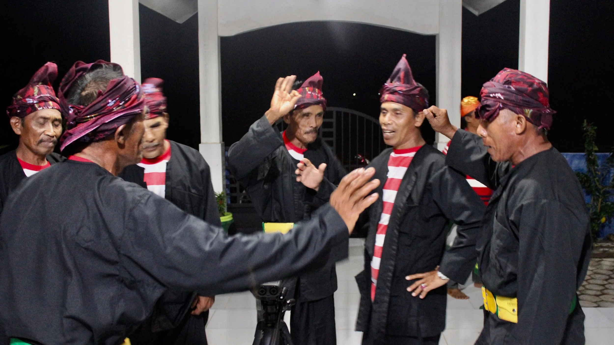 The a capella singing style called pangkak is in many ways unlike anything that I’ve ever heard, featuring a busy polyphonic style that is at once loose and remarkably complex. Male singers take turns imitating gendhang drums (“dum tak, dum dum tak”), unspooling long, vocable-filled solos, and making their way through a round-like structure which seems to mutate with each revolution. While singing in nearby Java and Madura is most famously heard in combination with instrumental ensembles like gamelan, those areas also have similar, equally obscure a capella traditions. Pangkak’s proto-beatboxing and gong-like vocal sound effects (“Telelelele!”), for instance, remind me of the incredible “vocal gamelan” from Banyumas, Central Java called jemblung. Jemblung is a theatrical a capella format where a quartet of actor-singers sit around a table and imitate the various sounds of the gamelan percussion ensemble with their mouths, complete with an earthy humor also found throughout pangkak.